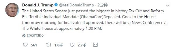 众议院二次投票通过后,共和党会将向特朗普提交这份税改法案。特朗普随即表示,众议院将于明早对税改议案进行投票,若众议院通过,将在当地时间下午1点(北京时间12月21日凌晨2点)左右在白宫召开新闻发布会。