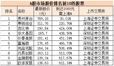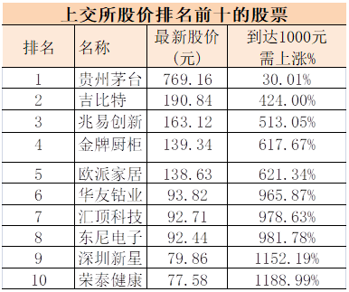 尽管相关人士表示,上交所的超千元股测试不是专门为了茅台,但从今日的收盘价来看,目前股价排名前10的股票中,茅台无疑是最接近千元目标的一只。
