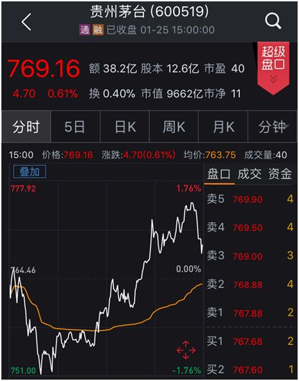 茅台上午随大盘下跌,而超千元股测试的消息在网上传开后,茅台股价下午开始拉升,一度达到今日最高点775元,最后收盘价落在769.16元,全日涨幅0.61%。