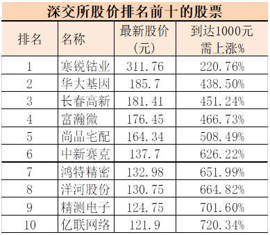 有些出乎意料的是,A股市场中,股价排名前十的有4只属于创业板股票。分别是寒锐钴业、华大基因、富瀚微和尚品宅配,寒锐钴业是股价最高之股,今日收盘价在311.76元,距离千元的股价仍需上涨220.76%。目前,深交所上市的公司,排名前十的股价都超过百元。