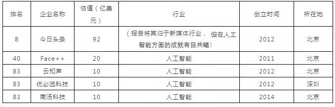 科技部火炬中心于2017年3月联合长城战略咨询发布了《2016中国独角兽企业发展报告》,共有131家企业进入独角兽企业榜单,其中涉及人工智能领域的5家企业。