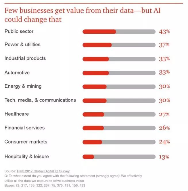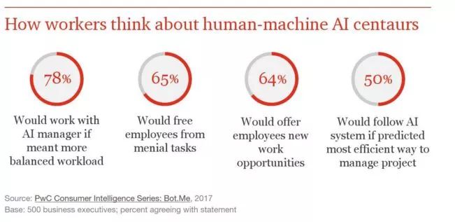 普华永道称,67%的管理层认为结合人类和机器的智能,AI将帮助人们和机器一起工作,获得更高的效率。AI 最强大的优势通常是间接的,因此商业组织可能会希望探索其它的ROI度量方法。54% 的企业高管表示,在他们的业务中使用AI解决方案已经提升了生产力。