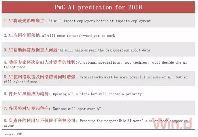 普华永道(PWC)近日发布2018 AI预测报告《塑造商业战略的8大洞察》(8 insights to shape business strategy)对未来12个月AI趋势进行了预测,普华永道对人工智能领域的8大趋势做出的分析,并剖析了其中的商业、政府以及社会发展机会。