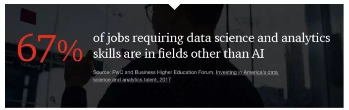 要使AI技术获得成功,目前的顶尖AI人才资源还不够。机构需要引入能与AI专家合作的领域专家。他们并非一定是程序员,但他们必须理解数据科学和数据可视化的基础,以及AI的工作思维方式。除了AI技术以外,67% 的工作将需要应用数据科学和分析技能。