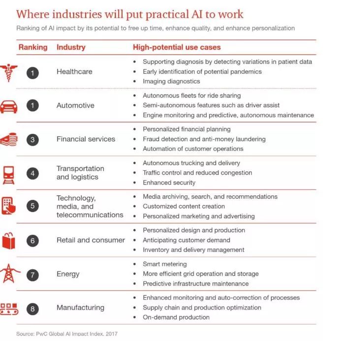 普华永道预测了将实现AI落地的8大行业,医疗保健、自动驾驶车队、机器人医生、金融服务、商业零售、能源、制造业以及优化人力和货物流动的智能基础设施8大行业最先面临行业剧变。