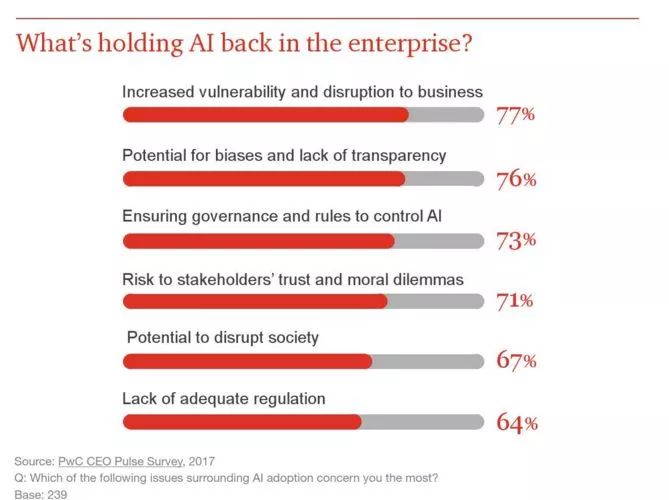 据 2017 年PWC调查,77%的公司 CEO 认为 AI 和自动化将进一步影响并瓦解他们的业务运作方式。利益相关者想要知道组织和机构正负责任地使用 AI,从而完善了业务,强化了整个社会的联系,AI 的应用场景将大大拓展。