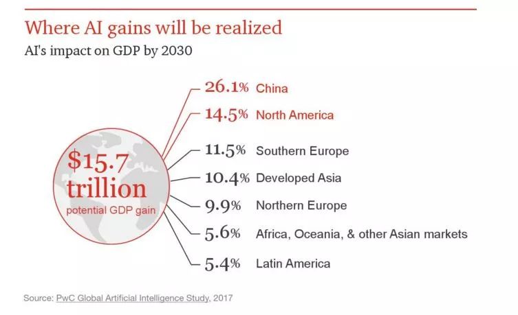 据普华永道的研究,人工智能产业规模在 2030 年将达到 15.7 万亿。人工智能可达到的规模已经超过了任何公司,很多国家在研究出台新战略从而获取最大利益。